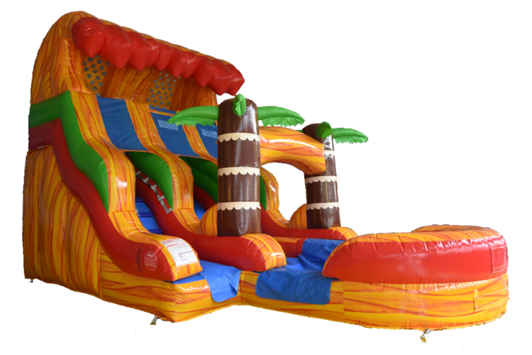 16' Lava Plummet Double Lane Slide — Bring big-time thrills and eye‑catching style to your event with this 16-foot-tall, double-lane slide. Two side‑by‑side lanes let guests race down simultaneously for fast turnover and nonstop excitement, making it perfect for birthday parties, school events, carnivals, and backyard blowouts. The bold “lava” color scheme and tropical accents create a dramatic centerpiece that photographs beautifully and draws a crowd. Commercial built for rental use, it features tall slide walls, a secure climbing access, reinforced seams, and durable vinyl to handle repeated events. Perfectly suited for all ages 6 and up who want a longer, faster ride — follow operator age and weight guidelines for safe play. If you need a high-capacity, show-stopping attraction that combines speed, safety, and striking visuals, this double-lane slide delivers.